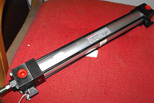 Norgren brand - A New, Type #EJ0988A6, Rev.#3 - 1-1/2" Bore x 13-1/2" Stroke Cylinder with mounting feet / or tabs, front and back, for mounting, as pictured. This cylinder can handle a maximum pressure of 150 psig, and a maximum temperature of 200 degree Fahrenheit. It has 3/8"NPT threaded ports, a 5/8" diameter shaft, and what looks to be adjustable air cushions at each end.